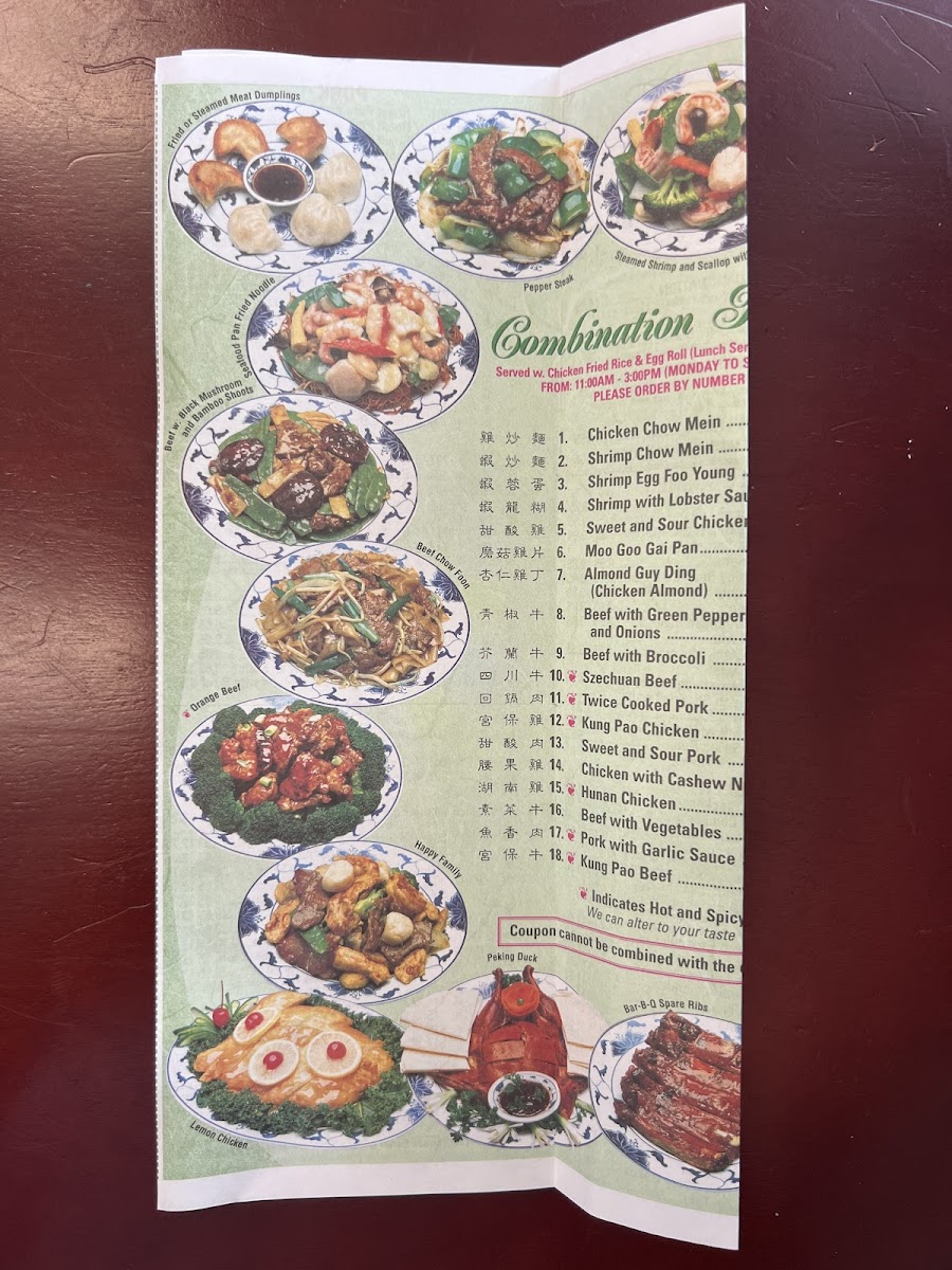 - Main Courses: Diverse entrees featuring pork, beef, shrimp, tofu, and mixed vegetables prepared in various styles including garlic sauce and Peking style.